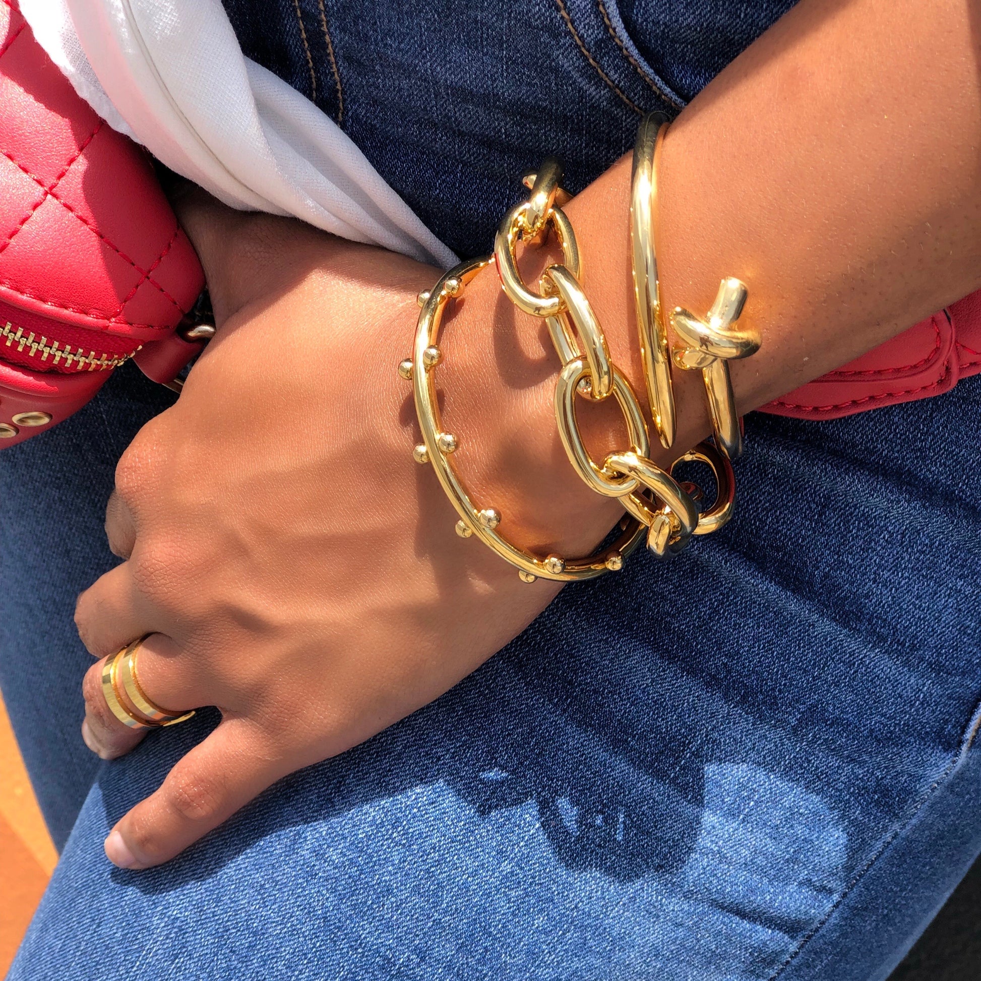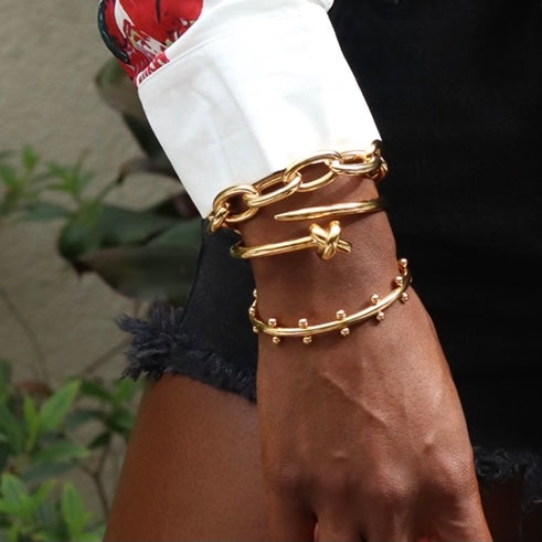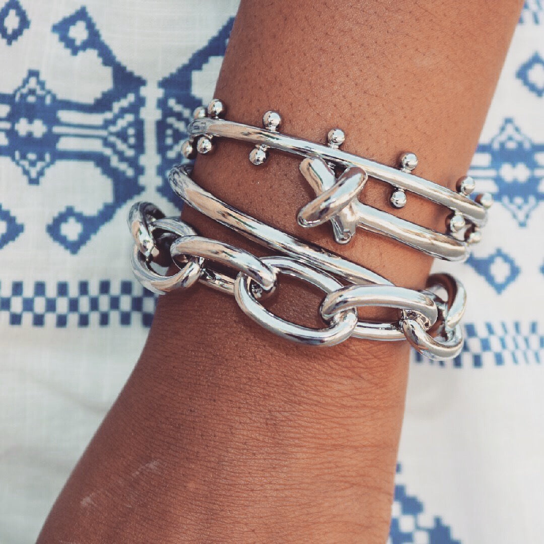 This beautiful exclusively curated Armcandy set is 100% tarnish free. The Kimberly Set has a stainless steel base dipped in 18K Gold or Sterling Steel. This (3) piece stackable set fits up to a 8 1/2" wrist with a 2â opening. Â